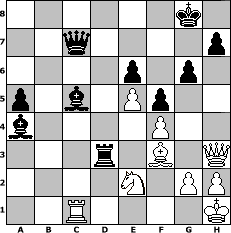 game notation in PGN-format [Event "ES kann nur einen geben :-)"] [Site "www.myChess.de"] [Date "2011.11.29"] [Round "2"] [White "ujack1961"] [Black "HenrySchinasky"] [ECO "B50"] [WhitemyELO "1639"] [BlackmyELO "2097"] [Result "0-1"] [TimeControl "10/864000"] [WhiteDays "39"] [BlackDays "39"] [MyChessNo "77810"] 1. e4 c5 2. Nf3 d6 3. Bc4 Nf6 4. Nc3 Nc6 5. d4 cxd4 6. Nxd4 e6 7. Bb3 a6 8. Be3 Be7 9. f4 O-O 10. O-O d5 11. Nxc6 bxc6 12. Qf3 Qc7 13. Rad1 Bb7 14. e5 Nd7 15. Qh3 Rad8 16. Ne2 Nc5 17. Bxc5 Bxc5+ 18. Kh1 Bb6 19. c3 c5 20. Bc2 g6 21. Qh6 f5 22. a3 Bc6 23. a4 d4 24. Qh3 dxc3 25. Nxc3 c4 26. b3 Rxd1 27. Bxd1 Rd8 28. bxc4 Rd2 29. Bf3 Rd3 30. c5 Bxc5 31. Ne2 a5 32. Rc1 Bxa4 0-1 position notation in FEN-format 6k1/2q4p/4p1p1/p1b1Pp2/b4P2/3r1B1Q/4N1PP/2R4K - - - 0 33 Captured white pieces: Captured black pieces: Click on a captured piece in order to display the desired move!
