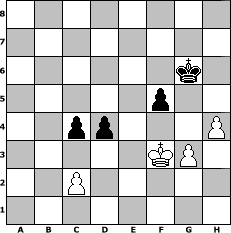 game notation in PGN-format [Event "Open II"] [Site "www.myChess.de"] [Date "2016.03.11"] [Round "1"] [White "Attila89"] [Black "Joschi"] [ECO "B12"] [WhitemyELO "1651"] [BlackmyELO "1512"] [Result "1/2-1/2"] [TimeControl "10/1728000"] [WhiteDays "138"] [BlackDays "120"] [MyChessNo "102885"] 1. e4 c6 2. d4 d5 3. f3 dxe4 4. fxe4 e5 5. Nf3 Bg4 6. Bc4 Qxd4 7. Bxf7+ Kxf7 8. Ng5+ Ke8 9. Qxg4 Qd7 10. Qf3 Nf6 11. O-O Bc5+ 12. Kh1 Rf8 13. Qb3 Na6 14. Nc3 h6 15. Ne6 Rg8 16. Rxf6 gxf6 17. Bxh6 Bd6 18. Rd1 Qe7 19. Nc7+ Nxc7 20. Qxg8+ Kd7 21. Qg7 Ne6 22. Qxe7+ Kxe7 23. Bg7 Bb4 24. Ne2 Rg8 25. Bh6 Rh8 26. Be3 a6 27. a3 Bc5 28. Bxc5+ Nxc5 29. Ng3 Ke6 30. Kg1 Rh4 31. Re1 b6 32. h3 Na4 33. b3 Nc3 34. Re3 Nb5 35. a4 Nd4 36. Rc3 c5 37. Kf2 Rf4+ 38. Ke3 Rh4 39. Ne2 Kd6 40. Rd3 Ke6 41. Nxd4+ exd4+ 42. Kf3 Ke5 43. Rd2 Rxe4 44. Re2 Rxe2 45. Kxe2 Kf4 46. Kf2 b5 47. axb5 axb5 48. g3+ Ke4 49. Ke2 c4 50. bxc4 bxc4 51. h4 Kf5 52. Kf3 Ke5 53. Ke2 f5 54. Kf3 Kf6 55. Kf2 Kg6 56. Kf3 Kh5 57. Kf4 Kg6 58. Kf3 Kh5 59. Kf4 Kg6 60. Kf3 1/2-1/2 position notation in FEN-format 8/8/6k1/5p2/2pp3P/5KP1/2P5/8 - - - 13 60 Captured white pieces: Captured black pieces: Click on a captured piece in order to display the desired move!