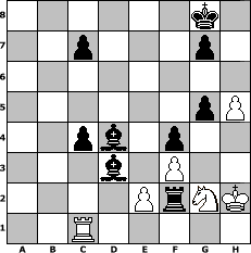 game notation in PGN-format [Event "November-Open 1/6"] [Site "www.myChess.de"] [Date "2007.11.05"] [Round "1"] [White "zoli"] [Black "muetoe"] [ECO "C22"] [WhitemyELO "1651"] [BlackmyELO "1827"] [Result "0-1"] [TimeControl "10/1728000"] [WhiteDays "13"] [BlackDays "20"] [MyChessNo "39470"] 1. e4 e5 2. d4 exd4 3. Qxd4 Nc6 4. Qe3 Nf6 5. Nf3 Be7 6. Nc3 d5 7. Bb5 O-O 8. exd5 Nxd5 9. Nxd5 Qxd5 10. Bd3 Bc5 11. Be4 Qh5 12. Qf4 Re8 13. O-O Bd6 14. Qg5 Qxg5 15. Nxg5 h6 16. Bxc6 bxc6 17. Nf3 Bf5 18. c3 c5 19. Be3 a5 20. Rfd1 a4 21. Rd2 Be4 22. Ne1 f5 23. g3 c4 24. Rd4 a3 25. bxa3 Ra4 26. Rad1 Kh7 27. R4d2 Rxa3 28. Bd4 f4 29. f3 Bg6 30. g4 Rea8 31. h4 Kg8 32. h5 Bh7 33. Ng2 Rxa2 34. Rxa2 Rxa2 35. Re1 Bd3 36. Be5 Bc5+ 37. Bd4 Bxd4+ 38. Kh2 Bxc3 39. Rg1 Bd4 40. Rc1 Rf2 41. g5 hxg5 0-1 position notation in FEN-format 6k1/2p3p1/8/6pP/2pb1p2/3b1P2/4PrNK/2R5 - - - 0 42 Captured white pieces: ![]() ![]() ![]() ![]() ![]() ![]() ![]() ![]() ![]() ![]() ![]() ![]() ![]() ![]() ![]() Captured black pieces: ![]() ![]() ![]() ![]() ![]() ![]() ![]() ![]() ![]() ![]() ![]() ![]() ![]() ![]() ![]() Click on a captured piece in order to display the desired move!