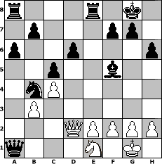 game notation in PGN-format [Event "wie w"] [Site "www.myChess.de"] [Date "2013.11.16"] [Round "1"] [White "Wulfen49"] [Black "Winston"] [ECO "B28"] [WhitemyELO "1356"] [BlackmyELO "1550"] [Result "0-1"] [TimeControl "10/1728000"] [WhiteDays "20"] [BlackDays "20"] [MyChessNo "91125"] 1. e4 c5 2. Nf3 a6 3. d4 e6 4. d5 exd5 5. exd5 d6 6. Bd3 h6 7. O-O Nf6 8. Re1+ Be7 9. b3 Nxd5 10. c4 Nf6 11. Nc3 O-O 12. Qc2 Nc6 13. Nd5 Nb4 14. Qc3 Nfxd5 15. Qd2 Nxd3 16. Qxd3 Nb4 17. Qc3 Bf6 18. Qd2 Bxa1 19. Bb2 Bxb2 20. a3 Bxa3 21. Ra1 Qf6 22. Rxa3 Bf5 23. Ra1 Qxa1+ 24. Ne1 Rfe8 0-1 position notation in FEN-format r3r1k1/1p3pp1/p2p3p/2p2b2/1nP5/1P6/3QPPPP/q3N1K1 - - - 2 25 Captured white pieces: Captured black pieces: Click on a captured piece in order to display the desired move!