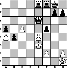 game notation in PGN-format [Event "Gary COME BACK Turnier"] [Site "www.myChess.de"] [Date "2005.03.18"] [Round "1"] [White "Master1"] [Black "Joschi"] [ECO "A00"] [WhitemyELO "1413"] [BlackmyELO "1601"] [Result "0-1"] [TimeControl "10/1728000"] [WhiteDays "19"] [BlackDays "19"] [MyChessNo "11269"] 1. f3 d5 2. e4 e5 3. Nc3 d4 4. Nce2 c5 5. c4 Nc6 6. a3 a6 7. d3 b5 8. b4 bxc4 9. dxc4 cxb4 10. a4 a5 11. g3 Be6 12. Bh3 Qd7 13. Bxe6 Qxe6 14. Qb3 Nf6 15. Bg5 Be7 16. Bxf6 Bxf6 17. O-O-O Bg5+ 18. f4 exf4 19. Nxd4 fxg3+ 20. Rd2 Bxd2+ 21. Kxd2 Nxd4 22. Qb1 g2 23. Ne2 gxh1=Q 24. Qxh1 Nxe2 25. Kxe2 O-O 26. c5 f5 27. Ke3 Rae8 0-1 position notation in FEN-format 4rrk1/6pp/4q3/p1P2p2/Pp2P3/4K3/5P1P/7Q - - - 2 28 Captured white pieces: Captured black pieces: Click on a captured piece in order to display the desired move!