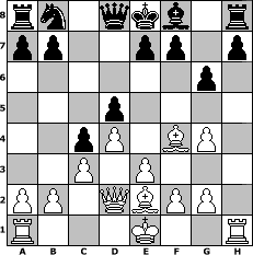 game notation in PGN-format [Event "Wargames-kill the King II"] [Site "www.myChess.de"] [Date "2005.11.18"] [Round "1"] [White "bopl"] [Black "Antaeus"] [ECO "D02"] [WhitemyELO "1502"] [BlackmyELO "1917"] [Result "1-0"] [TimeControl "10/864000"] [WhiteDays "10"] [BlackDays "00"] [MyChessNo "19784"] 1. d4 d5 2. Nf3 c5 3. c3 c4 4. Bf4 Nf6 5. Nbd2 g6 6. e3 Bg4 7. Be2 Ne4 8. h3 Nxd2 9. hxg4 Ne4 10. Nd2 Nxd2 11. Qxd2 1-0 position notation in FEN-format rn1qkb1r/pp2pp1p/6p1/3p4/2pP1BP1/2P1P3/PP1QBPP1/R3K2R - KQkq - 0 11 Captured white pieces: ![]() ![]() ![]() ![]() ![]() ![]() ![]() ![]() ![]() ![]() ![]() ![]() ![]() ![]() ![]() Captured black pieces: ![]() ![]() ![]() ![]() ![]() ![]() ![]() ![]() ![]() ![]() ![]() ![]() ![]() ![]() ![]() Click on a captured piece in order to display the desired move!