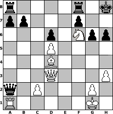 game notation in PGN-format [Event "Sommeranfang 2013"] [Site "www.myChess.de"] [Date "2013.06.21"] [Round "1"] [Board "2"] [White "deepsabel"] [Black "Seneca"] [ECO "A41"] [WhitemyELO "1998"] [BlackmyELO "1578"] [Result "1-0"] [TimeControl "10/2592000"] [WhiteDays "30"] [BlackDays "29"] [MyChessNo "88939"] 1. d4 d6 2. e4 Nf6 3. Nc3 c6 4. Nf3 Bg4 5. h3 Bh5 6. Be2 h6 7. O-O e6 8. Be3 Be7 9. Nd2 Bxe2 10. Qxe2 Nh7 11. Rad1 Nd7 12. d5 cxd5 13. exd5 e5 14. f4 O-O 15. Nc4 exf4 16. Bxf4 Nb6 17. Nxb6 Qxb6+ 18. Be3 Qxb2 19. Bd4 Bf6 20. Rxf6 Nxf6 21. Ne4 Qxa2 22. Nxf6+ Kh8 23. Qd3 g6 24. Ra1 1-0 position notation in FEN-format r4r1k/pp3p2/3p1Npp/3P4/3B4/3Q3P/q1P3P1/R5K1 - - - 1 24 Captured white pieces: Captured black pieces: Click on a captured piece in order to display the desired move!