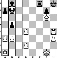 game notation in PGN-format [Event "Herbstturnier 2004"] [Site "www.myChess.de"] [Date "2004.09.02"] [Round "2"] [White "babylon148"] [Black "Andreas"] [ECO "A81"] [WhitemyELO "1515"] [BlackmyELO "1500"] [Result "1-0"] [TimeControl "10/2592000"] [WhiteDays "062"] [BlackDays "116"] [MyChessNo "6550"] 1. d4 f5 2. g3 d6 3. Nf3 Nf6 4. Bg2 e6 5. O-O Be7 6. c4 c6 7. Nc3 O-O 8. Qc2 Na6 9. a3 Nc7 10. b3 Bd7 11. e4 fxe4 12. Nxe4 Nxe4 13. Qxe4 Be8 14. Bf4 Bg6 15. Qe3 b5 16. cxb5 Nd5 17. Qxe6+ Bf7 18. Qe2 Nxf4 19. gxf4 cxb5 20. Ng5 Bxg5 21. Bxa8 Bxf4 22. Bg2 Qb6 23. Qd3 d5 24. Rfe1 Qb8 25. h3 Bh2+ 26. Kh1 Bg6 27. Bxd5+ Kh8 28. Be4 Rxf2 29. Bxg6 hxg6 30. Qxg6 Qb7+ 31. Re4 Bb8 32. Kg1 Rf8 33. Rh4+ 1-0 position notation in FEN-format 1b3r1k/pq4p1/6Q1/1p6/3P3R/PP5P/3P4/R5K1 - - - 6 33 Captured white pieces: ![]() ![]() ![]() ![]() ![]() ![]() ![]() ![]() ![]() ![]() ![]() ![]() ![]() ![]() ![]() Captured black pieces: ![]() ![]() ![]() ![]() ![]() ![]() ![]() ![]() ![]() ![]() ![]() ![]() ![]() ![]() ![]() Click on a captured piece in order to display the desired move!