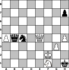 game notation in PGN-format [Event "2016"] [Site "www.myChess.de"] [Date "2016.01.01"] [Round "1"] [White "FrankB"] [Black "Joschi"] [ECO "A48"] [WhitemyELO "1669"] [BlackmyELO "1564"] [Result "1-0"] [TimeControl "10/2592000"] [WhiteDays "30"] [BlackDays "30"] [MyChessNo "101904"] 1. d4 Nf6 2. Nf3 g6 3. e3 d5 4. c4 e6 5. a3 Bg7 6. Nc3 O-O 7. Be2 Nbd7 8. O-O c5 9. Qc2 cxd4 10. Nxd4 dxc4 11. Bxc4 a6 12. b4 b5 13. Be2 Bb7 14. Bb2 Rc8 15. Qb3 Nb6 16. Rfd1 Qe7 17. Rac1 Nc4 18. Bxc4 Rxc4 19. Nce2 Rfc8 20. f3 Nd5 21. Kf2 Nb6 22. Rxc4 Rxc4 23. Rd2 Na4 24. Ba1 Qc7 25. g3 Ba8 26. Rc2 Nb6 27. Rxc4 Nxc4 28. Bc3 Qb7 29. e4 Qb6 30. Kg2 Qb7 31. Nc2 f5 32. Bxg7 Kxg7 33. Qc3+ Kh6 34. exf5 exf5 35. Ncd4 Qe7 36. Kf2 Qd6 37. Nc1 Qd5 38. Ncb3 g5 39. Nc5 g4 40. Nxa6 gxf3 41. Nc7 Qe4 42. Nxa8 Qxa8 43. Nxb5 Qc6 44. a4 Qe4 45. Qxf3 Qc2+ 46. Qe2 Qb3 47. Nd4 Qxb4 48. Qe6+ Kh5 49. Qxf5+ Kh6 50. Qf6+ Kh5 51. Qf7+ Kh6 52. Nf5+ Kg5 53. h4+ Kg4 54. Nh6+ Kh3 55. Qf5+ Kh2 56. Ng4+ Kh3 57. Ne3+ Kh2 58. Nf1+ Kh1 59. Qe4# 1-0 position notation in FEN-format 8/7p/8/8/Pqn1Q2P/6P1/5K2/5N1k - - - 12 59 Captured white pieces: Captured black pieces: Click on a captured piece in order to display the desired move!