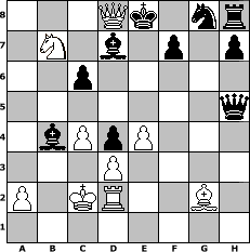 game notation in PGN-format [Event "Vereinsmeisterschaft YUGZ 2008-2009"] [Site "www.myChess.de"] [Date "2008.12.15"] [Round "1"] [White "carlo"] [Black "crca108"] [ECO "B11"] [WhitemyELO "1585"] [BlackmyELO "1376"] [Result "1-0"] [TimeControl "10/2592000"] [WhiteDays "85"] [BlackDays "86"] [MyChessNo "50726"] 1. e4 c6 2. Nc3 e5 3. d3 d5 4. f4 exf4 5. Bxf4 Bc5 6. Nge2 Qf6 7. Qd2 g5 8. Bxb8 Rxb8 9. O-O-O d4 10. Na4 Be7 11. c4 a5 12. h4 gxh4 13. Qxa5 Bd7 14. g3 hxg3 15. Nxg3 Qf4+ 16. Kc2 Qxg3 17. Nc5 Qf2+ 18. Rd2 Qf3 19. Qc7 Rd8 20. Nxb7 Qxh1 21. Bg2 Qh5 22. b4 Bxb4 23. Qxd8# 1-0 position notation in FEN-format 3Qk1nr/1N1b1p1p/2p5/7q/1bPpP3/3P4/P1KR2B1/8 - k - 0 23 Captured white pieces: Captured black pieces: Click on a captured piece in order to display the desired move!