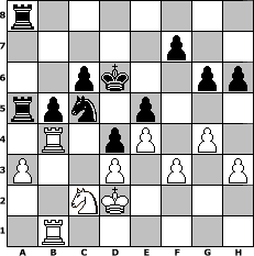 game notation in PGN-format [Event "Evans- Angenommen!"] [Site "www.myChess.de"] [Date "2005.04.04"] [Round "1"] [White "Caligula"] [Black "helrobe"] [ECO "C51"] [WhitemyELO "1480"] [BlackmyELO "1538"] [Result "1/2-1/2"] [TimeControl "10/1728000"] [WhiteDays "60"] [BlackDays "60"] [MyChessNo "11776"] 1. e4 e5 2. Nf3 Nc6 3. Bc4 Bc5 4. b4 Bxb4 5. O-O d6 6. d3 h6 7. c3 Bc5 8. Bb2 Bg4 9. h3 Bxf3 10. Qxf3 Qf6 11. Qxf6 Nxf6 12. Ba3 Bxa3 13. Nxa3 a6 14. Rfb1 Na5 15. Rb2 Nxc4 16. Nxc4 b5 17. Ne3 g6 18. Rab1 c6 19. c4 Kd7 20. cxb5 axb5 21. Nc2 Ra4 22. a3 Rha8 23. Rb3 d5 24. f3 Kd6 25. Kf2 d4 26. g4 Nd7 27. Ke2 Nc5 28. Rb4 R4a5 29. Kd2 1/2-1/2 position notation in FEN-format r7/5p2/2pk2pp/rpn1p3/1R1pP1P1/P2P1P1P/2NK4/1R6 - - - 6 29 Captured white pieces: Captured black pieces: Click on a captured piece in order to display the desired move!