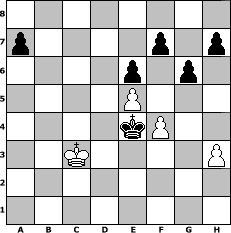 game notation in PGN-format [Event "Impfen ist Pflicht :-)"] [Site "www.myChess.de"] [Date "2021.04.29"] [Round "1"] [White "Mynona"] [Black "hsvler"] [ECO "A45"] [WhitemyELO "1324"] [BlackmyELO "1512"] [Result "0-1"] [TimeControl "10/2592000"] [WhiteDays "146"] [BlackDays "073"] [MyChessNo "122058"] 1. d4 Nf6 2. Bg5 e6 3. Bxf6 Qxf6 4. e4 d6 5. Nf3 Nc6 6. Bc4 Na5 7. Nbd2 Nxc4 8. Nxc4 g6 9. e5 dxe5 10. dxe5 Qf4 11. b3 b6 12. O-O Bg7 13. Qd3 Bb7 14. Rad1 O-O 15. Rfe1 Bxf3 16. Qxf3 Qxf3 17. gxf3 Rfd8 18. f4 Bh6 19. Rxd8+ Rxd8 20. Re4 b5 21. Ne3 Bf8 22. c4 c6 23. Nc2 Rd2 24. Nd4 Bc5 25. Nxc6 Bxf2+ 26. Kf1 bxc4 27. Re2 Rxe2 28. Kxe2 cxb3 29. axb3 Bg1 30. h3 Kf8 31. b4 Ke8 32. b5 Kd7 33. Kd3 Kc7 34. Nd4 Kb6 35. Kc4 Bxd4 36. Kxd4 Kxb5 37. Kc3 Kc5 38. Kd3 Kd5 39. Kc3 Ke4 0-1 position notation in FEN-format 8/p4p1p/4p1p1/4P3/4kP2/2K4P/8/8 - - - 6 40 Captured white pieces: Captured black pieces: Click on a captured piece in order to display the desired move!