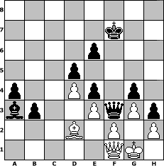 game notation in PGN-format [Event "Der Weihnachtsmann kommt bald."] [Site "www.myChess.de"] [Date "2010.11.05"] [Round "2"] [White "Lemmi11"] [Black "kischok46"] [ECO "E10"] [WhitemyELO "1790"] [BlackmyELO "2013"] [Result "0-1"] [TimeControl "10/1728000"] [WhiteDays "120"] [BlackDays "093"] [MyChessNo "69576"] 1. d4 Nf6 2. c4 e6 3. Nf3 d5 4. Nc3 c6 5. e3 Nbd7 6. Qc2 Bd6 7. Be2 O-O 8. b3 e5 9. Bb2 e4 10. Nd2 Re8 11. cxd5 cxd5 12. Rc1 a6 13. a3 Nb6 14. Qd1 Be6 15. O-O Rc8 16. Re1 Nfd7 17. b4 Qg5 18. g3 Nf6 19. b5 a5 20. Nb3 Ng4 21. Kg2 h5 22. Nc5 Rc7 23. N3a4 h4 24. Nxe6 fxe6 25. Bxg4 Nxa4 26. Qxa4 Qxg4 27. Qd1 h3+ 28. Kf1 Qf5 29. Rxc7 Bxc7 30. Qe2 a4 31. Rc1 Bd6 32. Ke1 Rf8 33. Rb1 Ra8 34. Kf1 Kh7 35. Kg1 g6 36. b6 Rc8 37. Rc1 Rxc1+ 38. Bxc1 Kg7 39. Qf1 Qg4 40. Kh1 Be7 41. Kg1 g5 42. Bb2 Kf6 43. Qe1 Qf3 44. Qf1 g4 45. Bc1 Kg5 46. Bb2 Bd8 47. Ba1 Bxb6 48. Bc3 Bc7 49. Bb4 Kg6 50. Bc5 b6 51. Bb4 Bb8 52. Be7 Kf7 53. Bb4 Bc7 54. Bc3 Bd6 55. Bd2 Bxa3 56. Bc3 b5 57. Be1 b4 58. Bd2 b3 0-1 position notation in FEN-format 8/5k2/4p3/3p4/p2Pp1p1/bp2PqPp/3B1P1P/5QK1 - - - 0 59 Captured white pieces: Captured black pieces: Click on a captured piece in order to display the desired move!