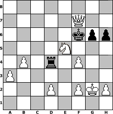 game notation in PGN-format [Event "und immer wieder Schach !"] [Site "www.myChess.de"] [Date "2009.11.06"] [Round "1"] [White "Steffi"] [Black "Ostseeboy"] [ECO "D20"] [WhitemyELO "1533"] [BlackmyELO "1202"] [Result "1-0"] [TimeControl "10/864000"] [WhiteDays "29"] [BlackDays "40"] [MyChessNo "60391"] 1. d4 d5 2. c4 dxc4 3. e4 Nc6 4. Nf3 e6 5. Nc3 Be7 6. Bxc4 Nf6 7. O-O O-O 8. Bg5 a6 9. a3 b5 10. Be2 Bb7 11. Rc1 h6 12. Bh4 Nh5 13. Bxe7 Qxe7 14. Re1 Rad8 15. d5 Na7 16. Bf1 exd5 17. exd5 Qc5 18. Nxb5 Nxb5 19. Rxc5 Nf4 20. Bxb5 axb5 21. Rxc7 Bxd5 22. Rc2 Bb3 23. Qb1 Bxc2 24. Qxc2 Rc8 25. Qf5 Ng6 26. Qxb5 Nf4 27. g3 Rcd8 28. gxf4 Rb8 29. Qe2 g6 30. b4 Ra8 31. Qa2 Kg7 32. Re7 Kf6 33. Rc7 Rad8 34. Ne5 Rd1+ 35. Kg2 Rd4 36. Rxf7+ Rxf7 37. Qxf7# 1-0 position notation in FEN-format 8/5Q2/5kpp/4N3/1P1r1P2/P7/3P1PKP/8 - - - 0 37 Captured white pieces: Captured black pieces: Click on a captured piece in order to display the desired move!