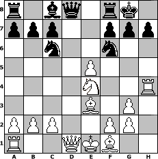 game notation in PGN-format [Event "Alapin-Diemer-Gambit Thematurnier"] [Site "www.myChess.de"] [Date "2010.01.23"] [Round "1"] [White "Lohl"] [Black "muellerh"] [ECO "C01"] [WhitemyELO "1458"] [BlackmyELO "1484"] [Result "1-0"] [TimeControl "10/2592000"] [WhiteDays "47"] [BlackDays "00"] [MyChessNo "62559"] 1. e4 e6 2. d4 d5 3. Be3 dxe4 4. Ne2 Nf6 5. Ng3 Bd6 6. Nd2 Bxg3 7. hxg3 O-O 8. Rh4 Nc6 9. Nxe4 e5 10. dxe5 1-0 position notation in FEN-format r1bq1rk1/ppp2ppp/2n2n2/4P3/4N2R/4B1P1/PPP2PP1/R2QKB2 - Q - 0 10 Captured white pieces: Captured black pieces: Click on a captured piece in order to display the desired move!