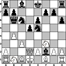 game notation in PGN-format [Event "Es gibt nur eineen Gott BelaFarinRod"] [Site "www.myChess.de"] [Date "2005.03.21"] [Round "1"] [White "Andylein1989"] [Black "Master1"] [ECO "C02"] [WhitemyELO "1276"] [BlackmyELO "1524"] [Result "0-1"] [TimeControl "10/864000"] [WhiteDays "06"] [BlackDays "10"] [MyChessNo "11375"] 1. e4 e6 2. d4 d5 3. e5 c5 4. c3 Nc6 5. Nf3 Qb6 6. dxc5 Bxc5 7. Qd2 Nge7 8. Qg5 Ng6 9. b4 Bxf2+ 10. Kd1 h6 11. Qd2 Ngxe5 0-1 position notation in FEN-format r1b1k2r/pp3pp1/1qn1p2p/3pn3/1P6/2P2N2/P2QPbPP/RNBK1B1R - kq - 0 12 Captured white pieces: Captured black pieces: Click on a captured piece in order to display the desired move!