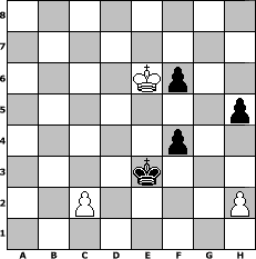 game notation in PGN-format [Event "Sommerpausen-F"] [Site "www.myChess.de"] [Date "2013.07.07"] [Round "1"] [White "beowulf"] [Black "Gauss1233"] [ECO "A36"] [WhitemyELO "1423"] [BlackmyELO "1396"] [Result "0-1"] [TimeControl "10/2592000"] [WhiteDays "150"] [BlackDays "104"] [MyChessNo "89178"] 1. c4 c5 2. Nc3 Nc6 3. g3 e6 4. Bg2 Nf6 5. d3 d5 6. Bg5 d4 7. Ne4 Be7 8. e3 dxe3 9. fxe3 Nb4 10. a3 Nxd3+ 11. Ke2 Nxb2 12. Qb3 Qb6 13. Qxb6 axb6 14. Nxf6+ Bxf6 15. Bxf6 gxf6 16. Rb1 Nxc4 17. Nf3 Nxa3 18. Rxb6 Nc4 19. Rbb1 Ra2+ 20. Kd3 Rxg2 21. Kxc4 Rf2 22. Rbf1 Rxf1 23. Rxf1 Kd7 24. Kxc5 e5 25. Kb6 Re8 26. Rd1+ Ke7 27. Ne1 Rd8 28. Rxd8 Kxd8 29. Nd3 h5 30. Nc5 f5 31. Nxb7+ Bxb7 32. Kxb7 Kd7 33. Kb6 Kd6 34. Kb5 Kd5 35. Kb4 Ke4 36. Kc5 Kxe3 37. Kd5 f6 38. Ke6 f4 39. gxf4 exf4 0-1 position notation in FEN-format 8/8/4Kp2/7p/5p2/4k3/2P4P/8 - - - 0 40 Captured white pieces: Captured black pieces: Click on a captured piece in order to display the desired move!