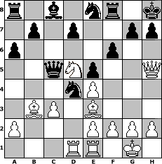 game notation in PGN-format [Event "Sweschnikow III"] [Site "www.myChess.de"] [Date "2012.09.05"] [Round "2"] [White "Joschi"] [Black "Andylein1989"] [ECO "B33"] [WhitemyELO "1608"] [BlackmyELO "1547"] [Result "1-0"] [TimeControl "10/1728000"] [WhiteDays "20"] [BlackDays "20"] [MyChessNo "83781"] 1. e4 c5 2. Nf3 Nc6 3. d4 cxd4 4. Nxd4 Nf6 5. Nc3 e5 6. Ndb5 Qa5 7. Bd2 Bb4 8. Bc4 O-O 9. O-O a6 10. Na3 Bxa3 11. bxa3 Qxa3 12. Bb3 Nd4 13. Bg5 Ne8 14. Nd5 Nc6 15. Re1 Kh8 16. Qh5 Qd6 17. Rad1 f6 18. Bc1 Qc5 19. Be3 Nd4 20. c3 1-0 position notation in FEN-format r1b1nr1k/1p1p2pp/p4p2/2qNp2Q/3nP3/1BP1B3/P3PPPP/3RR1K1 - - - 0 20 Captured white pieces: Captured black pieces: Click on a captured piece in order to display the desired move!
