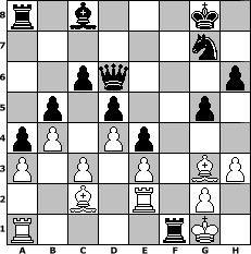 | game notation in PGN-format [Event "Zug um Zug gegen Fr"] [Site "www.myChess.de"] [Date "2010.05.04"] [Round "1"] [White "hape50"] [Black "Caligula"] [ECO "D00"] [WhitemyELO "1285"] [BlackmyELO "1360"] [Result "0-1"] [TimeControl "10/2592000"] [WhiteDays "90"] [BlackDays "90"] [MyChessNo "65328"] 1. d4 d5 2. h3 Nf6 3. e3 Nc6 4. Nc3 e5 5. a3 Bd6 6. Nge2 e4 7. Bd2 O-O 8. Ng3 Bxg3 9. fxg3 Qd6 10. Ne2 b6 11. Nf4 a5 12. Bb5 Bb7 13. c3 Ne7 14. g4 c6 15. Ba4 b5 16. Bc2 Ba6 17. b4 a4 18. O-O Bc8 19. Qe2 h6 20. Rf2 g5 21. Nh5 Nxh5 22. Be1 Ng7 23. Qf1 f5 24. gxf5 Nexf5 25. Re2 Ng3 26. Bxg3 Rxf1+ 0-1 position notation in FEN-format r1b3k1/6n1/2pq3p/1p1p2p1/pP1Pp3/P1P1P1BP/2B1R1P1/R4rK1 - - - 0 27 Captured white pieces:                              Captured black pieces:                               Click on a captured piece in order to display the desired move!