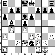 game notation in PGN-format [Event "Die letzen Wintertage!"] [Site "www.myChess.de"] [Date "2016.02.21"] [Round "1"] [White "hape50"] [Black "alpacino"] [ECO "A45"] [WhitemyELO "1304"] [BlackmyELO "1259"] [Result "0-1"] [TimeControl "10/2592000"] [WhiteDays "57"] [BlackDays "41"] [MyChessNo "102659"] 1. d4 Nf6 2. h3 d5 3. Nf3 Nbd7 4. e3 e6 5. Be2 Ne4 6. Bd2 Ndf6 7. a3 Bd7 8. Nc3 Nxc3 9. Bxc3 Ne4 10. Qd3 Bd6 11. b4 a6 12. O-O Bb5 13. Qd1 Nxc3 14. Qd2 Nxe2+ 0-1 position notation in FEN-format r2qk2r/1pp2ppp/p2bp3/1b1p4/1P1P4/P3PN1P/2PQnPP1/R4RK1 - kq - 0 15 Captured white pieces: Captured black pieces: Click on a captured piece in order to display the desired move!
