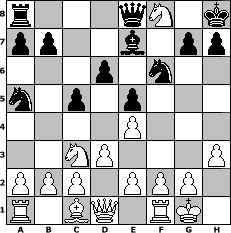 game notation in PGN-format [Event "Zwischendurchturnier"] [Site "www.myChess.de"] [Date "2011.01.14"] [Round "1"] [White "Winston"] [Black "Haki"] [ECO "B23"] [WhitemyELO "1451"] [BlackmyELO "1085"] [Result "1-0"] [TimeControl "10/864000"] [WhiteDays "10"] [BlackDays "10"] [MyChessNo "71143"] 1. e4 c5 2. Nc3 Nc6 3. Nf3 e5 4. Bc4 Be7 5. O-O Nf6 6. d3 d6 7. Ng5 O-O 8. h3 Na5 9. Bxf7+ Kh8 10. Be6 Bxe6 11. Nxe6 Qe8 12. Nxf8 1-0 position notation in FEN-format r3qN1k/pp2b1pp/3p1n2/n1p1p3/4P3/2NP3P/PPP1PPP1/R1BQ1RK1 - - - 0 12 Captured white pieces: Captured black pieces: Click on a captured piece in order to display the desired move!