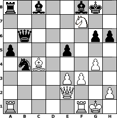 game notation in PGN-format [Event "Grünfeld zum Angewöhnen"] [Site "www.myChess.de"] [Date "2019.01.06"] [Round "2"] [White "Cuibono"] [Black "JohnWayne"] [ECO "D80"] [WhitemyELO "2268"] [BlackmyELO "1792"] [Result "1-0"] [TimeControl "10/2592000"] [WhiteDays "86"] [BlackDays "70"] [MyChessNo "114030"] 1. d4 Nf6 2. c4 g6 3. Nc3 d5 4. Bg5 Ne4 5. Bh4 c5 6. cxd5 Nxc3 7. bxc3 Qxd5 8. e3 Bg7 9. Nf3 cxd4 10. cxd4 Nc6 11. Be2 O-O 12. O-O Bf5 13. Nd2 e5 14. Rc1 Qxa2 15. Ra1 Qd5 16. Bc4 Qd6 17. g4 Bc8 18. Ne4 Qd7 19. d5 Nb4 20. f3 a5 21. Qe2 b5 22. Bxb5 Qxd5 23. Be7 Qb7 24. Bxf8 Bxf8 25. Bc4 Qb6 26. Ng5 h6 27. Nxf7 1-0 position notation in FEN-format r1b2bk1/5N2/1q4pp/p3p3/1nB3P1/4PP2/4Q2P/R4RK1 - - - 0 27 Captured white pieces: Captured black pieces: Click on a captured piece in order to display the desired move!