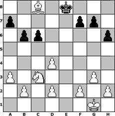 game notation in PGN-format [Event "8o Jahre Martin Gr,B 1000-1799 DWZ."] [Site "www.myChess.de"] [Date "2015.02.26"] [Round "1"] [White "clemensfritz"] [Black "Naunhofer"] [ECO "?"] [WhitemyELO "1558"] [BlackmyELO "1613"] [Result "1-0"] [TimeControl "10/2592000"] [WhiteDays "30"] [BlackDays "30"] [MyChessNo "98270"] 1. d4 Nf6 2. c4 e6 3. Nc3 d5 4. Bg5 Nbd7 5. e3 c6 6. Nf3 Be7 7. cxd5 exd5 8. Bd3 O-O 9. O-O h6 10. Bh4 Nb6 11. Qc2 Bg4 12. Ne5 Rc8 13. Bxf6 Bxf6 14. Nxg4 Re8 15. Nxf6+ Qxf6 16. Rfe1 Re7 17. Re2 Rce8 18. Rae1 Qg5 19. e4 dxe4 20. Nxe4 Qf4 21. g3 Qc7 22. Nc3 Kf8 23. Rxe7 Rxe7 24. Rxe7 Qxe7 25. a3 Nc8 26. Qe2 Qd7 27. Qe5 b6 28. Bf5 Qe8 29. Qxe8+ Kxe8 30. Bxc8 1-0 position notation in FEN-format 2B1k3/p4pp1/1pp4p/8/3P4/P1N3P1/1P1P1P1P/6K1 - - - 0 30 Captured white pieces: Captured black pieces: Click on a captured piece in order to display the desired move!