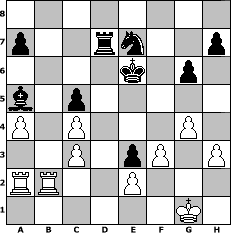 game notation in PGN-format [Event "2. Chess960/1"] [Site "www.myChess.de"] [Date "2008.03.15"] [Round "1"] [White "Heinz@"] [Black "Offi@ (adv.)"] [Variant "Fischerrandom"] [SetUp "1"] [FEN "rqnbbknr/pppppppp/8/8/8/8/PPPPPPPP/RQNBBKNR w KQkq - 0 1"] [WhitemyELO "1500"] [BlackmyELO "1500"] [Result "0-1"] [TimeControl "10/3456000"] [WhiteDays "83"] [BlackDays "76"] [MyChessNo "43409"] 1. c4 c5 2. Nf3 Nf6 3. Nb3 d6 4. d3 O-O 5. O-O b5 6. h3 e5 7. a4 bxc4 8. dxc4 Qb7 9. Bc2 Bc6 10. Bc3 Ne4 11. Nfd2 Nxc3 12. bxc3 g6 13. Be4 Bxe4 14. Nxe4 f5 15. Ng3 Rb8 16. Nd2 Ba5 17. Qc2 Qb2 18. Rfc1 Qxc2 19. Rxc2 e4 20. Ngf1 Rf7 21. Ne3 Rfb7 22. g4 Ne7 23. Raa2 Kf7 24. f3 f4 25. Nxe4 fxe3 26. Nxd6+ Ke6 27. Nxb7 Rxb7 28. Rcb2 Rd7 0-1 position notation in FEN-format 8/p2rn2p/4k1p1/b1p5/P1P3P1/2P1pP1P/RR2P3/6K1 - - - 2 29 Captured white pieces: Captured black pieces: Click on a captured piece in order to display the desired move!