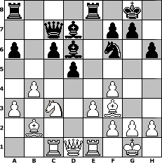game notation in PGN-format [Event "Endlich Fr"] [Site "www.myChess.de"] [Date "2014.03.25"] [Round "1"] [White "muellerh"] [Black "lasker"] [ECO "A03"] [WhitemyELO "1521"] [BlackmyELO "1150"] [Result "1-0"] [TimeControl "10/1728000"] [WhiteDays "33"] [BlackDays "00"] [MyChessNo "93635"] 1. f4 d5 2. Nf3 e6 3. e3 c5 4. d4 Nc6 5. c4 Nf6 6. Nc3 Be7 7. Be2 O-O 8. cxd5 exd5 9. O-O Re8 10. a3 cxd4 11. Nxd4 h6 12. b4 a6 13. Nxc6 bxc6 14. Bb2 Bd7 15. Bf3 Qc7 16. Rc1 Bd6 17. Re1 1-0 position notation in FEN-format r3r1k1/2qb1pp1/p1pb1n1p/3p4/1P3P2/P1N1PB2/1B3PPP/2RQR1K1 - - - 7 17 Captured white pieces: Captured black pieces: Click on a captured piece in order to display the desired move!