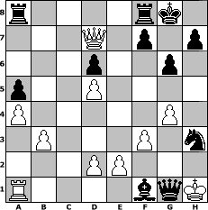 game notation in PGN-format [Event "Die Weinprobe 2017"] [Site "www.myChess.de"] [Date "2017.08.16"] [Round "1"] [White "MiFie"] [Black "Seneca"] [ECO "B07"] [WhitemyELO "1000"] [BlackmyELO "1558"] [Result "0-1"] [TimeControl "10/1728000"] [WhiteDays "37"] [BlackDays "54"] [MyChessNo "109249"] 1. e4 d6 2. Nf3 Nf6 3. Nc3 g6 4. Bb5+ c6 5. Bd3 Bg7 6. O-O O-O 7. h3 b5 8. b3 a5 9. g4 Na6 10. Nd4 Qb6 11. f3 Qxd4+ 12. Kh1 b4 13. Bb2 bxc3 14. Bxc3 Qb6 15. a4 Nc5 16. Bd4 Nfd7 17. c3 Bxd4 18. cxd4 Nxd3 19. Qc2 Ba6 20. d5 cxd5 21. exd5 Nf4 22. Qe4 Nxh3 23. Qxe7 Bxf1 24. Qxd7 Qg1# 0-1 position notation in FEN-format r4rk1/3Q1p1p/3p2p1/p2P4/P5P1/1P3P1n/3PP3/R4bqK - - - 1 25 Captured white pieces: Captured black pieces: Click on a captured piece in order to display the desired move!