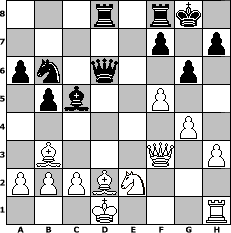 game notation in PGN-format [Event "f"] [Site "www.myChess.de"] [Date "2005.12.25"] [Round "1"] [White "Vouivre"] [Black "hermtz"] [ECO "C32"] [WhitemyELO "1428"] [BlackmyELO "1482"] [Result "0-1"] [TimeControl "10/864000"] [WhiteDays "10"] [BlackDays "10"] [MyChessNo "21123"] 1. e4 e5 2. f4 d5 3. exd5 e4 4. Nc3 Nf6 5. Bc4 Bg4 6. Nge2 Bc5 7. d4 exd3 8. Qxd3 O-O 9. Bd2 a6 10. O-O-O b5 11. Bb3 Nbd7 12. h3 Bxe2 13. Nxe2 Re8 14. g4 Ne4 15. d6 Nf2 16. Qd5 Rf8 17. dxc7 Qxc7 18. Qf5 g6 19. Qd5 Nxd1 20. Kxd1 Rad8 21. f5 Nb6 22. Qf3 Qd6 0-1 position notation in FEN-format 3r1rk1/5p1p/pn1q2p1/1pb2P2/6P1/1B3Q1P/PPPBN3/3K3R - - - 3 23 Captured white pieces: Captured black pieces: Click on a captured piece in order to display the desired move!