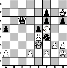 game notation in PGN-format [Event "Mit Dame Gambit ins Fr"] [Site "www.myChess.de"] [Date "2006.01.31"] [Round "2"] [White "romain63"] [Black "MaxPayne"] [ECO "D20"] [WhitemyELO "1526"] [BlackmyELO "1555"] [Result "1-0"] [TimeControl "10/864000"] [WhiteDays "10"] [BlackDays "10"] [MyChessNo "22148"] 1. d4 d5 2. c4 dxc4 3. Qa4+ Nc6 4. e3 e6 5. Bxc4 Bd7 6. Qc2 Nf6 7. Nf3 Bd6 8. Nc3 O-O 9. O-O a6 10. e4 e5 11. d5 Ne7 12. Bg5 Ng6 13. h3 h6 14. Be3 Qc8 15. Kh2 c6 16. Rad1 cxd5 17. Nxd5 Bb5 18. b3 Bxc4 19. bxc4 Bc5 20. Bxc5 Qxc5 21. Nxf6+ gxf6 22. Rd5 Qe7 23. Rd1 Rfd8 24. Qb3 Nf4 25. Rxd8+ Rxd8 26. Rxd8+ Qxd8 27. Qxb7 Qd3 28. c5 Qf1 29. Qc8+ Kh7 30. Qf5+ Kg7 31. Qg4+ Kh7 32. Qg3 a5 33. c6 Qc4 34. Nh4 Qxc6 35. Nf5 Ng6 36. Qe3 Nf4 37. g3 1-0 position notation in FEN-format 8/5p1k/2q2p1p/p3pN2/4Pn2/4Q1PP/P2P1P1K/8 - - - 0 37 Captured white pieces: ![]() ![]() ![]() ![]() ![]() ![]() ![]() ![]() ![]() ![]() ![]() ![]() ![]() ![]() ![]() Captured black pieces: ![]() ![]() ![]() ![]() ![]() ![]() ![]() ![]() ![]() ![]() ![]() ![]() ![]() ![]() ![]() Click on a captured piece in order to display the desired move!