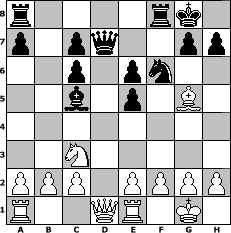 game notation in PGN-format [Event "OhneEngine vom Fr"] [Site "www.myChess.de"] [Date "2010.04.23"] [Round "2"] [White "Hannes"] [Black "kuschwl"] [ECO "C40"] [WhitemyELO "1414"] [BlackmyELO "1416"] [Result "0-1"] [TimeControl "10/2592000"] [WhiteDays "00"] [BlackDays "30"] [MyChessNo "65046"] 1. e4 e5 2. Nf3 Bc5 3. d4 exd4 4. Nxd4 Nc6 5. Nxc6 bxc6 6. Nc3 d6 7. Bc4 Be6 8. Bxe6 fxe6 9. O-O Nf6 10. Bg5 O-O 11. Re1 Qd7 12. e5 dxe5 0-1 position notation in FEN-format r4rk1/p1pq2pp/2p1pn2/2b1p1B1/8/2N5/PPP1PPPP/R2QR1K1 - - - 0 13 Captured white pieces: Captured black pieces: Click on a captured piece in order to display the desired move!