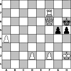 game notation in PGN-format [Event "Gegen die Herbstdepression"] [Site "www.myChess.de"] [Date "2008.12.01"] [Round "2"] [White "neve"] [Black "babikar"] [ECO "D06"] [WhitemyELO "1447"] [BlackmyELO "1376"] [Result "1-0"] [TimeControl "10/864000"] [WhiteDays "10"] [BlackDays "10"] [MyChessNo "50383"] 1. d4 d5 2. c4 Nf6 3. Nf3 dxc4 4. Nc3 e6 5. e4 Bb4 6. Bg5 Bxc3+ 7. bxc3 h6 8. Bxf6 Qxf6 9. Bxc4 O-O 10. O-O Rd8 11. Ne5 Nc6 12. Nxc6 bxc6 13. Rc1 c5 14. d5 exd5 15. exd5 Re8 16. Bb5 Re5 17. Bc6 Rb8 18. Qa4 a6 19. Rb1 Rxb1 20. Rxb1 Re2 21. Rf1 Qxc3 22. h3 Bxh3 23. gxh3 Qxh3 24. d6 cxd6 25. Qxa6 Qg4+ 26. Bg2 c4 27. Qxd6 c3 28. Qc6 Re6 29. Qa8+ Kh7 30. Rc1 Qf4 31. Rxc3 Re1+ 32. Bf1 Qg5+ 33. Qg2 Rxf1+ 34. Kxf1 Qb5+ 35. Kg1 Qb1+ 36. Kh2 Qb8+ 37. Qg3 Qb2 38. a4 h5 39. Rc7 g6 40. Rxf7+ Kh6 41. Qf4+ g5 42. Qd6+ Qf6 43. Qxf6# 1-0 position notation in FEN-format 8/5R2/5Q1k/6pp/P7/8/3P1P1K/8 - - - 0 43 Captured white pieces: ![]() ![]() ![]() ![]() ![]() ![]() ![]() ![]() ![]() ![]() ![]() ![]() ![]() ![]() ![]() Captured black pieces: ![]() ![]() ![]() ![]() ![]() ![]() ![]() ![]() ![]() ![]() ![]() ![]() ![]() ![]() ![]() Click on a captured piece in order to display the desired move!
