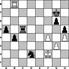 game notation in PGN-format [Event "Sommer 2025"] [Site "www.myChess.de"] [Date "2025.05.13"] [Round "1"] [White "Alencar"] [Black "Lohl"] [ECO "A23"] [WhitemyELO "1409"] [BlackmyELO "1305"] [Result "0-1"] [TimeControl "10/2592000"] [WhiteDays "051"] [BlackDays "150"] [MyChessNo "133323"] 1. c4 e5 2. Nc3 Nf6 3. g3 c6 4. Bg2 Bc5 5. Nf3 O-O 6. O-O d5 7. cxd5 cxd5 8. Nxe5 Re8 9. d4 Bb6 10. Bg5 h6 11. Bxf6 Qxf6 12. Qd2 Ba5 13. Bxd5 Rd8 14. Bxf7+ Kh8 15. Ng6+ Kh7 16. Nf8+ Rxf8 17. Qd3+ Kh8 18. Bh5 Nc6 19. e3 Nb4 20. Qg6 Qxg6 21. Bxg6 Bh3 22. Rfd1 Rf6 23. Bd3 Raf8 24. Bf1 Bxf1 25. Rxf1 Nc2 26. Rac1 Nb4 27. a3 Nd3 28. Rc2 Bxc3 29. bxc3 b5 30. Kg2 h5 31. f4 g6 32. h4 Ra6 33. Ra2 Rc8 34. Rc2 Rxa3 35. Rd1 Nb4 36. Rb2 Nd5 37. Rd3 Nxc3 38. Rc2 b4 39. d5 Nxd5 40. Rcd2 Rxd3 41. Rxd3 Rc5 42. e4 Nc3 43. Rd8+ Kg7 44. Rb8 Nxe4 45. Kf3 Nd2+ 46. Kf2 a5 0-1 position notation in FEN-format 1R6/6k1/6p1/p1r4p/1p3P1P/6P1/3n1K2/8 - - - 0 47 Captured white pieces: Captured black pieces: Click on a captured piece in order to display the desired move!