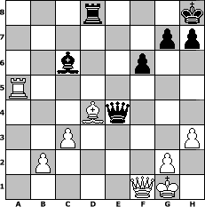 game notation in PGN-format [Event "mySchachR5 (1600-1900)"] [Site "www.myChess.de"] [Date "2009.07.10"] [Round "1"] [White "Nowak"] [Black "Plaidroller"] [ECO "B33"] [WhitemyELO "1704"] [BlackmyELO "1808"] [Result "1-0"] [TimeControl "10/1728000"] [WhiteDays "19"] [BlackDays "00"] [MyChessNo "57349"] 1. e4 c5 2. Nf3 Nc6 3. d4 cxd4 4. Nxd4 Nf6 5. Nc3 d6 6. Be2 e5 7. Nb3 Be7 8. O-O O-O 9. Be3 a5 10. Nd2 Be6 11. Nc4 b5 12. Nxb5 Nxe4 13. Nb6 Rb8 14. Nd5 Bg5 15. f4 exf4 16. Nxf4 Bxf4 17. Rxf4 d5 18. Rb1 Qe7 19. a4 Rfe8 20. Ra1 Ne5 21. Rf1 Nc4 22. Bxc4 dxc4 23. Qe1 c3 24. Nxc3 Rb4 25. Nxe4 Rxe4 26. Qc3 Rc8 27. Qd2 Qc7 28. c3 Bb3 29. Rf5 Rxa4 30. Rxa4 Bxa4 31. Bd4 f6 32. Rc5 Bc6 33. Qe2 Qd7 34. Rxa5 Re8 35. Qc4+ Kh8 36. Qf1 Qg4 37. Bf2 Rd8 38. h3 Qe4 39. Bd4 1-0 position notation in FEN-format 3r3k/6pp/2b2p2/R7/3Bq3/2P4P/1P4P1/5QK1 - - - 2 39 Captured white pieces: Captured black pieces: Click on a captured piece in order to display the desired move!