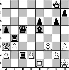 game notation in PGN-format [Event "Mal wieder spielen 2"] [Site "www.myChess.de"] [Date "2013.05.12"] [Round "1"] [White "FrankB"] [Black "miu"] [ECO "E60"] [WhitemyELO "1621"] [BlackmyELO "1576"] [Result "0-1"] [TimeControl "10/1728000"] [WhiteDays "74"] [BlackDays "47"] [MyChessNo "88283"] 1. d4 Nf6 2. c4 g6 3. Nf3 Bg7 4. Nc3 d5 5. cxd5 Nxd5 6. e4 Nb6 7. Be3 Bg4 8. Be2 N8d7 9. O-O O-O 10. h3 Bxf3 11. Bxf3 Nc4 12. Qc2 Nxe3 13. fxe3 c5 14. Rad1 cxd4 15. exd4 Rc8 16. Qb3 Nb6 17. e5 e6 18. Bxb7 Rb8 19. Be4 Nd5 20. Qa3 Ne3 21. b3 Nxf1 22. Kxf1 a5 23. Bf3 Rb4 24. d5 Qb6 25. Re1 Rc8 26. Na4 Qb5+ 27. Kg1 Rc2 28. dxe6 fxe6 29. Nc5 Qxc5+ 30. Kh1 Bxe5 0-1 position notation in FEN-format 6k1/7p/4p1p1/p1q1b3/1r6/QP3B1P/P1rP2P1/4R2K - - - 0 31 Captured white pieces: Captured black pieces: Click on a captured piece in order to display the desired move!