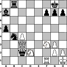 game notation in PGN-format [Event "Wrixum - Open die III."] [Site "www.myChess.de"] [Date "2006.10.24"] [Round "1"] [White "romain63"] [Black "bane"] [ECO "D02"] [WhitemyELO "1648"] [BlackmyELO "1733"] [Result "0-1"] [TimeControl "10/3456000"] [WhiteDays "000"] [BlackDays "120"] [MyChessNo "29457"] 1. d4 d5 2. Nf3 c5 3. c3 c4 4. Bf4 Nc6 5. Nbd2 Nf6 6. Qc2 Nh5 7. Bg3 Bg4 8. e4 e6 9. Be2 Be7 10. O-O O-O 11. Rae1 Nxg3 12. fxg3 b5 13. exd5 Bf5 14. Qc1 Qxd5 15. Nh4 Bd3 16. Bxd3 cxd3 17. Nhf3 b4 18. Re3 bxc3 19. bxc3 Qxa2 20. Rxd3 a5 21. c4 Rfb8 22. d5 exd5 23. Rxd5 Nb4 24. Rd7 Bc5+ 25. Kh1 Ra7 26. Rxa7 Bxa7 27. Qc3 Qc2 0-1 position notation in FEN-format 1r4k1/b4ppp/8/p7/1nP5/2Q2NP1/2qN2PP/5R1K - - - 2 28 Captured white pieces: Captured black pieces: Click on a captured piece in order to display the desired move!