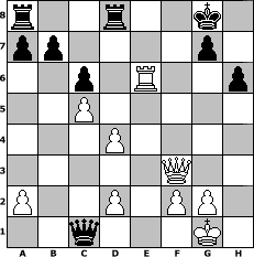 game notation in PGN-format [Event "F"] [Site "www.myChess.de"] [Date "2008.07.24"] [Round "1"] [White "Steffi"] [Black "Juliette2103"] [ECO "A40"] [WhitemyELO "1500"] [BlackmyELO "1603"] [Result "0-1"] [TimeControl "10/1728000"] [WhiteDays "20"] [BlackDays "15"] [MyChessNo "46518"] 1. d4 e6 2. c4 Nf6 3. Nc3 Bb4 4. Nf3 O-O 5. Bg5 d5 6. e3 Nbd7 7. Ne5 c6 8. Bd3 dxc4 9. Bxc4 h6 10. Bh4 Bd6 11. Nxd7 Bxd7 12. O-O Be7 13. Rc1 Nd5 14. Bxe7 Qxe7 15. Re1 Nxc3 16. bxc3 e5 17. Bb3 Rfd8 18. h3 Be6 19. c4 exd4 20. exd4 Qg5 21. c5 Bxh3 22. Qf3 Be6 23. Bxe6 fxe6 24. Rxe6 Qxc1+ 0-1 position notation in FEN-format r2r2k1/pp4p1/2p1R2p/2P5/3P4/5Q2/P2P1PP1/2q3K1 - - - 0 25 Captured white pieces: Captured black pieces: Click on a captured piece in order to display the desired move!