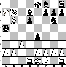 game notation in PGN-format [Event "Sweschnikow II"] [Site "www.myChess.de"] [Date "2012.04.28"] [Round "2"] [White "Sanji"] [Black "Naunhofer"] [ECO "B33"] [WhitemyELO "1627"] [BlackmyELO "1640"] [Result "1-0"] [TimeControl "10/1728000"] [WhiteDays "19"] [BlackDays "20"] [MyChessNo "81321"] 1. e4 c5 2. Nf3 Nc6 3. d4 cxd4 4. Nxd4 Nf6 5. Nc3 e5 6. Ndb5 d6 7. Nd5 Nxd5 8. exd5 Ne7 9. c3 Ng6 10. Qa4 Bd7 11. Qc4 Rc8 12. Qb4 Rc5 13. Be3 Rxd5 14. Nxa7 Qa5 15. Qxb7 e4 16. Bb6 Rd1+ 17. Rxd1 1-0 position notation in FEN-format 4kb1r/NQ1b1ppp/1B1p2n1/q7/4p3/2P5/PP2PPPP/3RKB1R - Kk - 0 17 Captured white pieces: Captured black pieces: Click on a captured piece in order to display the desired move!