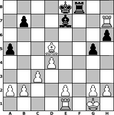 game notation in PGN-format [Event "4.Clubmeisterschaft Aljechins Enkel 2010"] [Site "www.myChess.de"] [Date "2010.12.07"] [Round "1"] [White "Holzhacker"] [Black "Schefsche"] [ECO "C34"] [WhitemyELO "2069"] [BlackmyELO "1393"] [Result "1-0"] [TimeControl "10/3456000"] [WhiteDays "118"] [BlackDays "082"] [MyChessNo "70416"] 1. e4 e5 2. f4 exf4 3. Nf3 Nc6 4. d4 d6 5. Bxf4 Bg4 6. c3 Nf6 7. Bd3 Bxf3 8. Qxf3 Qe7 9. O-O O-O-O 10. Nd2 h6 11. Nc4 g5 12. Bxd6 cxd6 13. Qxf6 Qxf6 14. Rxf6 Rd7 15. e5 dxe5 16. Bf5 Nd8 17. Nxe5 Ne6 18. Nxd7 Kxd7 19. Rxf7+ Ke8 20. Bxe6 Be7 21. Re1 Rf8 22. Rh7 a5 23. Bd5 1-0 position notation in FEN-format 4kr2/1p2b2R/7p/p2B2p1/3P4/2P5/PP2P1PP/4R1K1 - - - 1 23 Captured white pieces: Captured black pieces: Click on a captured piece in order to display the desired move!
