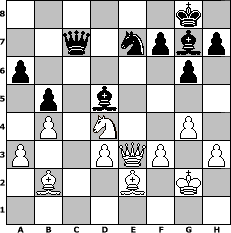 game notation in PGN-format [Event "5erd4"] [Site "www.myChess.de"] [Date "2022.06.29"] [Round "1"] [White "UPS"] [Black "kalle"] [ECO "B23"] [WhitemyELO "1656"] [BlackmyELO "1580"] [Result "1/2-1/2"] [TimeControl "10/3456000"] [WhiteDays "77"] [BlackDays "72"] [MyChessNo "126216"] 1. e4 c5 2. Nc3 d6 3. a3 g6 4. Nd5 a6 5. h3 e6 6. Ne3 Bg7 7. c3 Nc6 8. Nf3 Nge7 9. Be2 O-O 10. O-O d5 11. exd5 exd5 12. Nc2 d4 13. cxd4 Nxd4 14. Ncxd4 cxd4 15. d3 Nf5 16. b4 Be6 17. Bb2 Rc8 18. Rc1 Qd5 19. Rc4 b5 20. Rxc8 Rxc8 21. Qd2 Qd7 22. Rc1 Bh6 23. Rxc8+ Qxc8 24. Qd1 Bg7 25. g4 Ne7 26. Nxd4 Bd5 27. Qd2 Bb7 28. f3 Bd5 29. Kg2 Qc7 30. Qe3 1/2-1/2 position notation in FEN-format 6k1/2q1npbp/p5p1/1p1b4/1P1N2P1/P2PQP1P/1B2B1K1/8 - - - 4 30 Captured white pieces: ![]() ![]() ![]() ![]() ![]() ![]() ![]() ![]() ![]() ![]() ![]() ![]() ![]() ![]() ![]() Captured black pieces: ![]() ![]() ![]() ![]() ![]() ![]() ![]() ![]() ![]() ![]() ![]() ![]() ![]() ![]() ![]() Click on a captured piece in order to display the desired move!