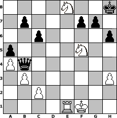 game notation in PGN-format [Event "Winter 2018"] [Site "www.myChess.de"] [Date "2018.01.10"] [Round "2"] [White "jeremyt"] [Black "pepo47"] [ECO "B07"] [WhitemyELO "2125"] [BlackmyELO "2051"] [Result "1/2-1/2"] [TimeControl "10/2592000"] [WhiteDays "045"] [BlackDays "117"] [MyChessNo "111017"] 1. e4 d6 2. d4 Nf6 3. Nc3 e5 4. Nf3 Nbd7 5. Bc4 Be7 6. O-O O-O 7. Re1 c6 8. a4 a5 9. b3 exd4 10. Nxd4 Ne5 11. Bf1 Re8 12. Qd2 h6 13. Ba3 Nh5 14. Nde2 Bg4 15. Rad1 Qc8 16. Qc1 Qc7 17. h3 Bxh3 18. gxh3 Nf3+ 19. Kg2 Bg5 20. Qa1 Nh4+ 21. Kh1 d5 22. Bg2 Bf6 23. Qc1 Qb6 24. Qe3 d4 25. Nxd4 Bg5 26. f4 Nxg2 27. Kxg2 Nxf4+ 28. Kf1 Ng2 29. Qg3 Nxe1 30. Qxe1 Rad8 31. Nf5 Re6 32. e5 Rde8 33. Bd6 Bf4 34. Ne4 Bxe5 35. Bxe5 Rxe5 36. Nf6+ Kh8 37. Nxe8 Rxe1+ 38. Rxe1 Qb4 1/2-1/2 position notation in FEN-format 4N2k/1p3pp1/2p4p/p4N2/Pq6/1P5P/2P5/4RK2 - - - 1 39 Captured white pieces: Captured black pieces: Click on a captured piece in order to display the desired move!