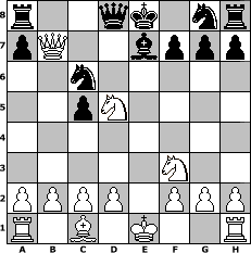 game notation in PGN-format [Event "Dabei ist alles 3"] [Site "www.myChess.de"] [Date "2008.05.14"] [Round "1"] [White "rakl"] [Black "thw"] [ECO "C00"] [WhitemyELO "1656"] [BlackmyELO "1556"] [Result "1-0"] [TimeControl "10/864000"] [WhiteDays "10"] [BlackDays "10"] [MyChessNo "44844"] 1. e4 e6 2. Nf3 c5 3. Nc3 d5 4. exd5 exd5 5. Bb5+ Bd7 6. Qe2+ Be7 7. Nxd5 Bxb5 8. Qxb5+ Nc6 9. Qxb7 1-0 position notation in FEN-format r2qk1nr/pQ2bppp/2n5/2pN4/8/5N2/PPPP1PPP/R1B1K2R - KQkq - 0 9 Captured white pieces: Captured black pieces: Click on a captured piece in order to display the desired move!