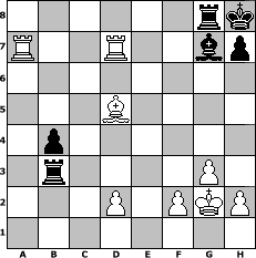 game notation in PGN-format [Event "Modernes Benoni"] [Site "www.myChess.de"] [Date "2010.01.14"] [Round "2"] [White "Robur"] [Black "Joschi"] [ECO "A61"] [WhitemyELO "1799"] [BlackmyELO "1570"] [Result "1-0"] [TimeControl "10/2592000"] [WhiteDays "089"] [BlackDays "116"] [MyChessNo "62395"] 1. d4 Nf6 2. c4 c5 3. d5 e6 4. Nc3 exd5 5. cxd5 d6 6. Nf3 Be7 7. g3 O-O 8. Bg2 a6 9. O-O b5 10. a3 Bb7 11. e4 Nbd7 12. e5 Nxe5 13. Nxe5 dxe5 14. d6 Qxd6 15. Bxb7 Rab8 16. Qxd6 Bxd6 17. Bxa6 b4 18. axb4 cxb4 19. Ne2 Ne4 20. Be3 Nc5 21. Bxc5 Bxc5 22. Rac1 Bd6 23. Rfd1 Be7 24. Rd7 Bf6 25. Rcc7 Ra8 26. Bc4 e4 27. Bxf7+ Kh8 28. b3 Ra1+ 29. Kg2 Ra2 30. Nf4 Be5 31. Ra7 Rc2 32. Bg6 Rb2 33. Bxe4 Rxb3 34. Ne6 Rg8 35. Nxg7 Bxg7 36. Bd5 1-0 position notation in FEN-format 6rk/R2R2bp/8/3B4/1p6/1r4P1/3P1PKP/8 - - - 1 36 Captured white pieces: Captured black pieces: Click on a captured piece in order to display the desired move!