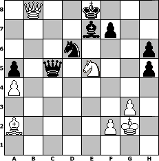 game notation in PGN-format [Event "Aschermittwoch 2014"] [Site "www.myChess.de"] [Date "2014.03.06"] [Round "1"] [White "deepsabel"] [Black "woern63"] [ECO "D32"] [WhitemyELO "2032"] [BlackmyELO "1940"] [Result "1/2-1/2"] [TimeControl "10/3456000"] [WhiteDays "166"] [BlackDays "122"] [MyChessNo "93338"] 1. d4 d5 2. c4 e6 3. Nc3 c5 4. cxd5 cxd4 5. Qa4+ Bd7 6. Qxd4 exd5 7. Qxd5 Nf6 8. Qxb7 Nc6 9. Bf4 Rc8 10. e3 Nh5 11. Rd1 Nxf4 12. exf4 Bc5 13. Rd2 Rb8 14. Qa6 O-O 15. Nf3 Bd6 16. Nd5 Qe8+ 17. Be2 Be6 18. a3 Bxd5 19. Rxd5 Qe6 20. Rd2 Bxf4 21. Rc2 Qf5 22. Qd3 Qf6 23. O-O Rxb2 24. Rxb2 Qxb2 25. Qe4 Qf6 26. g3 Bb8 27. Kg2 g6 28. Rb1 Kg7 29. h4 Rc8 30. h5 Bd6 31. Rc1 Ne7 32. Rxc8 Nxc8 33. a4 gxh5 34. Bd3 h6 35. Qb7 Qc3 36. Qd5 Bf8 37. Bb1 Qc5 38. Qe4 Nd6 39. Qh7+ Kf6 40. Qh8+ Ke7 41. Ba2 a5 42. Qb2 Ke8 43. Ne5 Be7 44. Qb8+ 1/2-1/2 position notation in FEN-format 1Q2k3/4bp2/3n3p/p1q1N2p/P7/6P1/B4PK1/8 - - - 5 44 Captured white pieces: Captured black pieces: Click on a captured piece in order to display the desired move!