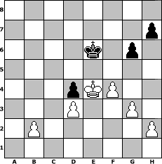 game notation in PGN-format [Event "Faires Schach"] [Site "www.myChess.de"] [Date "2007.03.25"] [Round "1"] [White "Seneca"] [Black "Greenhorn"] [ECO "A07"] [WhitemyELO "1541"] [BlackmyELO "1678"] [Result "1-0"] [TimeControl "10/3456000"] [WhiteDays "146"] [BlackDays "177"] [MyChessNo "33743"] 1. Nf3 d5 2. g3 Nf6 3. Bg2 g6 4. O-O Bg7 5. d3 O-O 6. Nbd2 Ne8 7. c3 c5 8. e4 d4 9. cxd4 cxd4 10. Nc4 b5 11. Na3 Nc7 12. Rb1 e5 13. Bd2 Nc6 14. Rc1 Bb7 15. Qb3 a6 16. Nb1 a5 17. Rc5 a4 18. Qc2 Qd6 19. Na3 b4 20. Nb5 Nxb5 21. Rxb5 Rfc8 22. Bh3 Rc7 23. Rc1 b3 24. axb3 axb3 25. Qxb3 Bc8 26. Bxc8 Raxc8 27. Rb6 Qe7 28. Bb4 Qd7 29. Kg2 Bh6 30. Rc5 Bg7 31. Rd5 Qe8 32. Bd6 Rd7 33. Qb5 Ne7 34. Rc5 Ra8 35. Bxe5 Nc8 36. Rb8 Rxb8 37. Qxb8 Rd8 38. Bxg7 Kxg7 39. Qe5+ Qxe5 40. Nxe5 Ne7 41. Rc7 Kf6 42. Rxe7 Kxe7 43. Nc6+ Kd7 44. Nxd8 Kxd8 45. e5 Ke7 46. f4 f5 47. exf6+ Kxf6 48. Kf3 Ke6 49. Ke4 1-0 position notation in FEN-format 8/7p/4k1p1/8/3pKP2/3P2P1/1P5P/8 - - - 3 49 Captured white pieces: Captured black pieces: Click on a captured piece in order to display the desired move!
