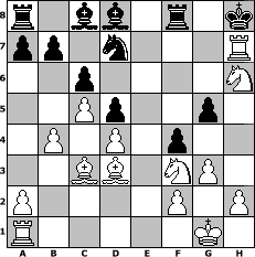 game notation in PGN-format [Event "Faires Schach"] [Site "www.myChess.de"] [Date "2007.03.25"] [Round "1"] [White "thw"] [Black "augustus"] [ECO "B07"] [WhitemyELO "1524"] [BlackmyELO "1096"] [Result "1-0"] [TimeControl "10/3456000"] [WhiteDays "120"] [BlackDays "103"] [MyChessNo "33763"] 1. e4 d6 2. d4 e6 3. c4 Qf6 4. Nf3 Qg6 5. Nc3 f5 6. exf5 exf5 7. g3 Be7 8. Nd5 Bd8 9. Bd3 c6 10. Nf4 Qf7 11. O-O h6 12. Re1+ Ne7 13. Bd2 O-O 14. Bc3 Bb6 15. b4 g5 16. Ng2 Nd7 17. c5 Bc7 18. Ne3 f4 19. Ng4 Qg7 20. Qe2 d5 21. Qxe7 Qxe7 22. Rxe7 Bd8 23. Nxh6+ Kh8 24. Rh7# 1-0 position notation in FEN-format r1bb1r1k/pp1n3R/2p4N/2Pp2p1/1P1P1p2/2BB1NP1/P4P1P/R5K1 - - - 2 24 Captured white pieces: Captured black pieces: Click on a captured piece in order to display the desired move!
