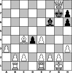 game notation in PGN-format [Event "MySchachOpen"] [Site "www.myChess.de"] [Date "2005.01.22"] [Round "2"] [White "Falcor"] [Black "icke"] [ECO "C61"] [WhitemyELO "1337"] [BlackmyELO "1242"] [Result "1-0"] [TimeControl "10/2592000"] [WhiteDays "81"] [BlackDays "84"] [MyChessNo "9961"] 1. e4 e5 2. Nf3 Nc6 3. Bb5 Nd4 4. Nxd4 exd4 5. d3 c6 6. Ba4 Nh6 7. Bxh6 gxh6 8. O-O Bg7 9. Nd2 O-O 10. Nf3 b5 11. Bb3 a5 12. a3 a4 13. Ba2 d5 14. h3 dxe4 15. dxe4 c5 16. Qd3 Ra7 17. Rfe1 Re8 18. Qxb5 Ba6 19. Qxa4 Qb8 20. Rab1 Bc8 21. Qxe8+ Bf8 22. Ne5 Qb6 23. Nxf7 Re7 24. Qxc8 Qg6 25. Ne5+ c4 26. Nxg6 Kg7 27. Nxe7 Bxe7 28. Bxc4 Bf6 29. Qg8# 1-0 position notation in FEN-format 6Q1/6kp/5b1p/8/2BpP3/P6P/1PP1PPP1/1R2R1K1 - - - 2 29 Captured white pieces: Captured black pieces: Click on a captured piece in order to display the desired move!