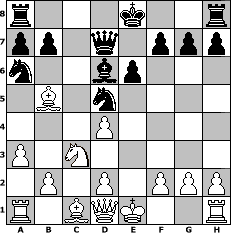 game notation in PGN-format [Event "Wintereinbruch"] [Site "www.myChess.de"] [Date "2015.10.18"] [Round "1"] [White "reisinger"] [Black "Attila89"] [ECO "E00"] [WhitemyELO "1425"] [BlackmyELO "1583"] [Result "1-0"] [TimeControl "10/1728000"] [WhiteDays "40"] [BlackDays "40"] [MyChessNo "100810"] 1. d4 Nf6 2. c4 e6 3. a3 c5 4. Nf3 Na6 5. Nc3 d5 6. cxd5 Nxd5 7. e3 Bd7 8. Ne5 cxd4 9. exd4 Bd6 10. Nxd7 Qxd7 11. Bb5 1-0 position notation in FEN-format r3k2r/pp1q1ppp/n2bp3/1B1n4/3P4/P1N5/1P1P1PPP/R1BQK2R - KQkq - 1 11 Captured white pieces: Captured black pieces: Click on a captured piece in order to display the desired move!