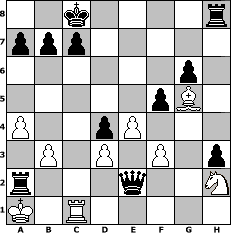 game notation in PGN-format [Event "unter uns Nr. 12,"] [Site "www.myChess.de"] [Date "2013.11.01"] [Round "1"] [White "alpacino"] [Black "rux"] [ECO "C26"] [WhitemyELO "1371"] [BlackmyELO "1496"] [Result "0-1"] [TimeControl "10/864000"] [WhiteDays "41"] [BlackDays "48"] [MyChessNo "90910"] 1. e4 e5 2. Nc3 Nf6 3. Bd3 Bb4 4. Nce2 Bc5 5. Nf3 Ng4 6. O-O Bxf2+ 7. Rxf2 Nxf2 8. Kxf2 d5 9. b3 d4 10. Nxe5 Qf6+ 11. Nf3 Bg4 12. Ng3 Nc6 13. Bb2 Bxf3 14. gxf3 O-O-O 15. Qe2 Rhe8 16. a3 Qh4 17. Kg2 Ne5 18. a4 Ng6 19. Nf5 Nf4+ 20. Kf1 Qh3+ 21. Ke1 Nxe2 22. Bxe2 g6 23. Ng3 Qxh2 24. Nf1 Qh4+ 25. Kd1 Qf4 26. d3 h5 27. Bc1 Qf6 28. Bd2 Re5 29. Kc1 h4 30. Nh2 Qh8 31. Bf4 Re6 32. Kb2 Qh5 33. Rf1 f5 34. Bd2 h3 35. Rg1 Qh4 36. Bg5 Qf2 37. Rh1 Rh8 38. Bf1 Rc6 39. Ka1 Rxc2 40. Be2 Qxe2 41. Rc1 Ra2+ 0-1 position notation in FEN-format 2k4r/ppp5/6p1/5pB1/P2pP3/1P1P1P1p/r3q2N/K1R5 - - - 2 42 Captured white pieces: Captured black pieces: Click on a captured piece in order to display the desired move!