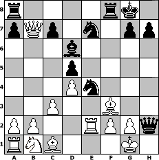 game notation in PGN-format [Event "Advents-Open 2011"] [Site "www.myChess.de"] [Date "2011.11.27"] [Round "1"] [White "Haki"] [Black "nogumo"] [ECO "C42"] [WhitemyELO "1348"] [BlackmyELO "1708"] [Result "0-1"] [TimeControl "10/864000"] [WhiteDays "10"] [BlackDays "06"] [MyChessNo "77716"] 1. e4 e5 2. Nf3 Nf6 3. Nxe5 d6 4. Nf3 Nxe4 5. d4 d5 6. Bd3 Bg4 7. O-O Bd6 8. Re1 f5 9. Be2 O-O 10. h3 Nc6 11. c3 Qf6 12. hxg4 fxg4 13. Qb3 Ne7 14. Qxb7 gxf3 15. Bxf3 Qh4 16. Re2 Qh2+ 0-1 position notation in FEN-format r4rk1/pQp1n1pp/3b4/3p4/3Pn3/2P2B2/PP2RPPq/RNB3K1 - - - 3 17 Captured white pieces: ![]() ![]() ![]() ![]() ![]() ![]() ![]() ![]() ![]() ![]() ![]() ![]() ![]() ![]() ![]() Captured black pieces: ![]() ![]() ![]() ![]() ![]() ![]() ![]() ![]() ![]() ![]() ![]() ![]() ![]() ![]() ![]() Click on a captured piece in order to display the desired move!