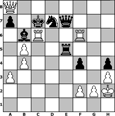 game notation in PGN-format [Event "Herbstturnier bis 1600"] [Site "www.myChess.de"] [Date "2025.10.14"] [Round "1"] [White "Winston"] [Black "Achimkogge"] [ECO "C20"] [WhitemyELO "1536"] [BlackmyELO "1226"] [Result "1-0"] [TimeControl "10/2592000"] [WhiteDays "150"] [BlackDays "148"] [MyChessNo "133749"] 1. e4 e5 2. a3 Bc5 3. h3 Nf6 4. Nc3 c6 5. Nf3 d6 6. d3 b5 7. b4 Bb6 8. Bd2 h6 9. Ne2 Be6 10. Ng3 g5 11. Nf5 Nh5 12. Nh2 Nf4 13. Ng4 Bxf5 14. exf5 f6 15. Nxf6+ Qxf6 16. Qf3 Qxf5 17. Rc1 d5 18. Bxf4 gxf4 19. Be2 h5 20. O-O Nd7 21. Rfe1 Bd4 22. c3 Bb6 23. Bd1 O-O-O 24. Bb3 Rdg8 25. c4 Rg5 26. Kh2 Rhg8 27. Rg1 h4 28. cxb5 R8g7 29. Rxc6+ Kd8 30. Bxd5 Re7 31. Be4 Qf8 32. Rgc1 Re8 33. Bg6 Rxg6 34. Rxg6 Ke7 35. Rcc6 Kd8 36. Rcd6 e4 37. dxe4 Re7 38. e5 Rxe5 39. Rgf6 Qe7 40. Qa8+ Kc7 41. Rc6# 1-0 position notation in FEN-format Q7/p1knq3/1bR2R2/1P2r3/1P3p1p/P6P/5PPK/8 - - - 5 41 Captured white pieces: Captured black pieces: Click on a captured piece in order to display the desired move!