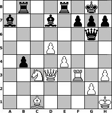 game notation in PGN-format [Event "Wikingermeisterschaft Endrunde"] [Site "www.myChess.de"] [Date "2006.08.05"] [Round "2"] [White "73DADDELDU37"] [Black "chessmike"] [ECO "A00"] [WhitemyELO "1551"] [BlackmyELO "1954"] [Result "0-1"] [TimeControl "10/1728000"] [WhiteDays "60"] [BlackDays "59"] [MyChessNo "27439"] 1. e3 d5 2. Bd3 e5 3. c3 c5 4. Ne2 Nc6 5. Bb5 Bd7 6. d4 cxd4 7. Bxc6 bxc6 8. cxd4 e4 9. O-O Bd6 10. f3 exf3 11. Rxf3 Nf6 12. h3 O-O 13. Nbc3 Qe7 14. Nf4 Rfe8 15. a3 Rab8 16. b4 a5 17. b5 cxb5 18. Ncxd5 Nxd5 19. Nxd5 Qe4 20. Nc3 Qg6 21. e4 Bc6 22. d5 Bd7 23. Qd3 b4 24. axb4 axb4 25. Ra7 Bc5+ 26. Kh1 Bxa7 0-1 position notation in FEN-format 1r2r1k1/b2b1ppp/6q1/3P4/1p2P3/2NQ1R1P/6P1/2B4K - - - 0 27 Captured white pieces: Captured black pieces: Click on a captured piece in order to display the desired move!